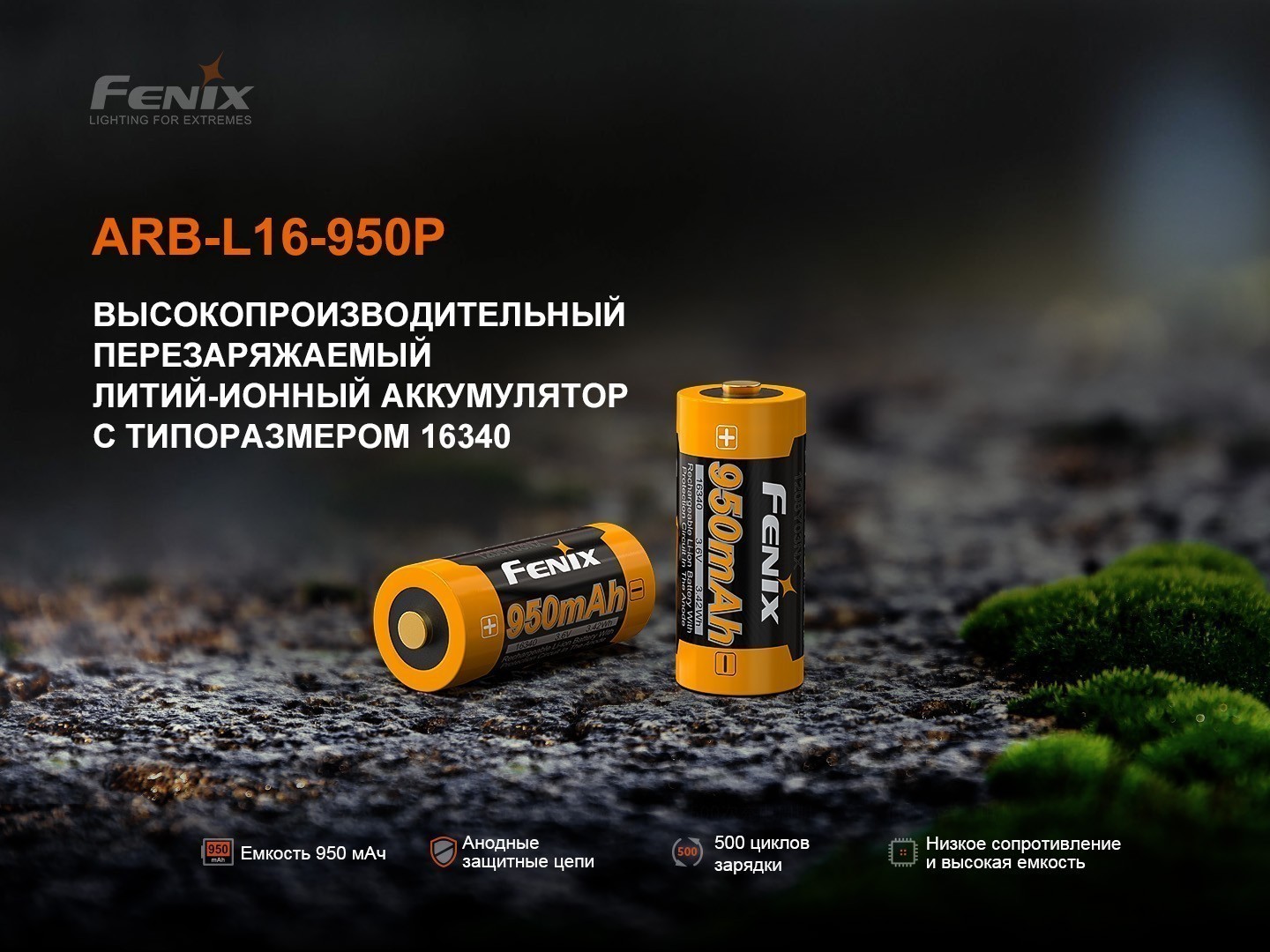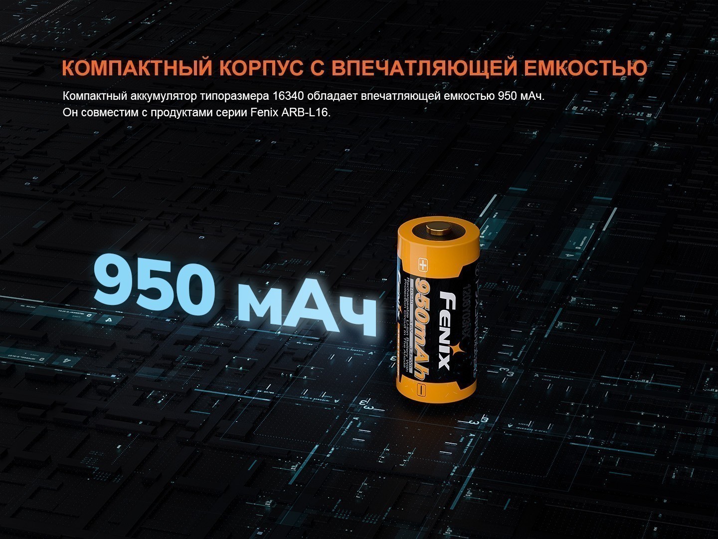 ARB-L16-950P — совместимый аккумулятор для фонарей Fenix и универсальный аккумулятор для фонарей других брендов, поддерживающих формат 16340 и напряжение 3.7В.