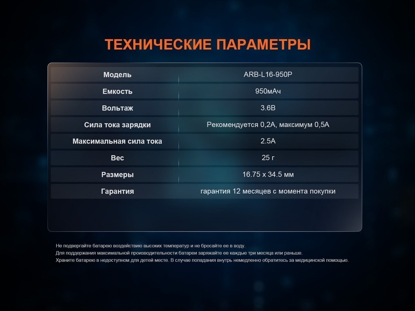 Используйте аккумулятор Fenix ARB-L16-950P только с совместимыми зарядными устройствами. Не подвергайте аккумулятор механическим повреждениям и не используйте при экстремальных температурах. Правильная эксплуатация продлит срок службы и сохранит характеристики аккумулятора.
