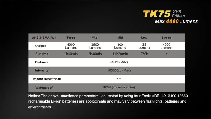 Что же касается надежности модели Fenix TK75 (2015), то она базируется на стандартных для компании Fenix технологиях и материалах, которые уже стали визитной карточкой компании. В него встроены четыре светодиода производства одной из крупнейших американских фирм — Cree (модель Cree XM-L2 (U2)). Помимо того, что они производят световой поток яркостью до 4000 люмен и дальностью распространения 650 м, эти светодиоды характеризуются невероятно длительным сроком эксплуатации. Каждый из них проработает не менее 50 000 ч, что даже в условиях непрерывного освещения составляет 5,7 лет. Помимо того, в фонаре используется несколько защитных механизмов, которые призваны устранить возможные проблемы при негативных условиях эксплуатации Fenix TK75 (2015). Так, фонарь защищен от короткого замыкания, яркость его света постоянно стабилизируется при помощи цифрового драйвера. И конечно же, корпус фонаря Fenix TK75 (2015) сделан из анодированного авиационного алюминия. Этот прочный и легкий материал выступает механической защитой от ударов и других возможных повреждений. Корпус совершенно не пропускает внутрь влагу, за счет чего фонарь даже можно кратковременно использовать под водою (не дольше 30 мин при погружении на 2 м).