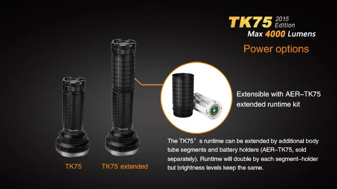 Кстати говоря, модель Fenix TK75 (2015) может работать и с половинным количеством элементов питания. Яркость во всех режимах останется прежней, а вот время работы в этом случае уменьшится вдвое. Впрочем, производители предусмотрели и обратный вариант. За счет приобретаемой отдельно дополнительной секции корпуса, в фонарь можно установить еще один комплект аккумуляторов, что вдвое увеличит время его автономной работы.