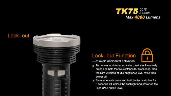 Чтобы элементы питания не разряжались преждевременно из-за случайного включения фонаря во время транспортировки в рюкзаке или багажнике автомобиля, Fenix TK75 (2015) оснащен механизмом блокировки. Эта функция также отличает данную модель от вышедших ранее. Чтобы заблокировать включение света, необходимо в течение 3 с держать нажатыми обе кнопки фонаря. Повторное такое нажатие снимает блокировку и возвращает фонарь в обычный режим использования. Остаток заряда аккумуляторов всегда можно проверить при помощи встроенного индикатора.