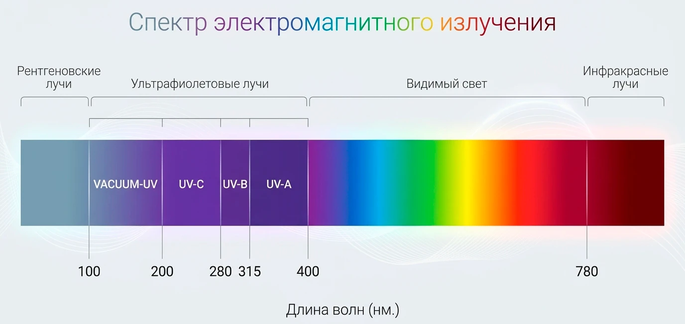 Это примерно как сказать “зелёный” без уточнения. Есть светло-зелёный, есть зелёно-жёлтый, есть зелёно-синий – и все они ведут себя по-разному. С ультрафиолетом похожая история, только вместо привычных названий используется длина волны в нанометрах (нм).