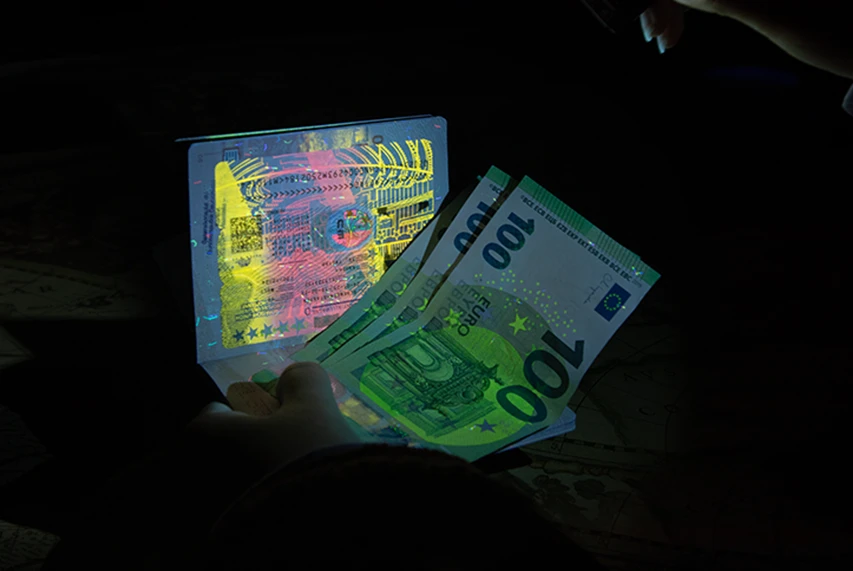Под UV становятся видны водяные знаки, скрытые нити, специальные метки и элементы печати, которые в обычном свете незаметны. Это быстрый и наглядный способ проверки без дополнительного оборудования.