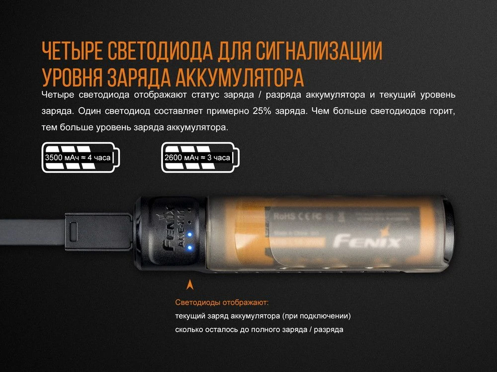 В наборе Fenix ARE-X11 Charging Kit присутствует один фирменный литий-ионный аккумулятор формата 18650 ARB-L-18 с номинальной емкостью 3500 мАч. Данная модель имеет защиту от перегрева, перезаряда/переразряда и способна выдержать до 500 полных циклов перезарядки. Производитель заявляет что при активной эксплуатации эта модель в год будет терять не более 10% от номинальной емкости.