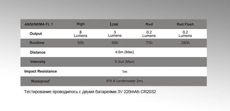 - Low: белый луч 3 люмена, 90 часов работы до разрядки;