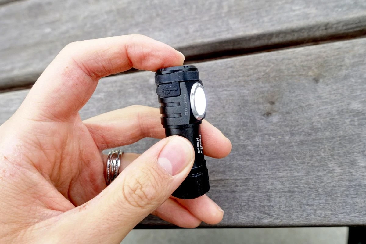 За счёт Г-образной компоновки фонаря (когда светодиод расположен перпендикулярно оси корпуса), модель HM50R удобно использовать держа в руках, закрепив на снаряжении или головном уборе.