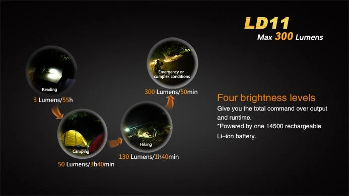 Яркость и время работы фонаря находятся в прямой зависимости от того, какой тип элементов питания установлен в батарейный отсек. Fenix LD11 работает на пальчиковых щелочных батарейках, никель-металлгидридных или же литий-ионных аккумуляторах. Внутрь батарейного отсека помещается только один элемент за раз. При этом время работы Fenix LD11 в самом экономном режиме для никель-металлгидридного аккумулятора и щелочной батарейки составляет 70 ч, а для литий-ионного аккумулятора — 55 ч. Впрочем, однозначно отдать предпочтение первым двум элементам питания нельзя, поскольку Li-ion аккумулятор позволяет получить более яркий свет, который не доступен в других случаях.