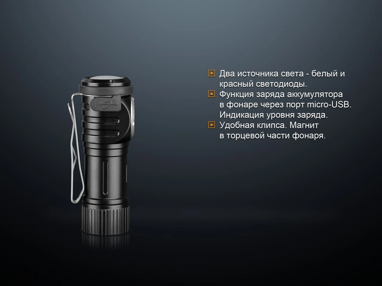 В торцевой части корпуса располагается достаточно мощный магнит, способный надёжно удерживать фонарь на металлической поверхности под любым углом и даже вверх дном.