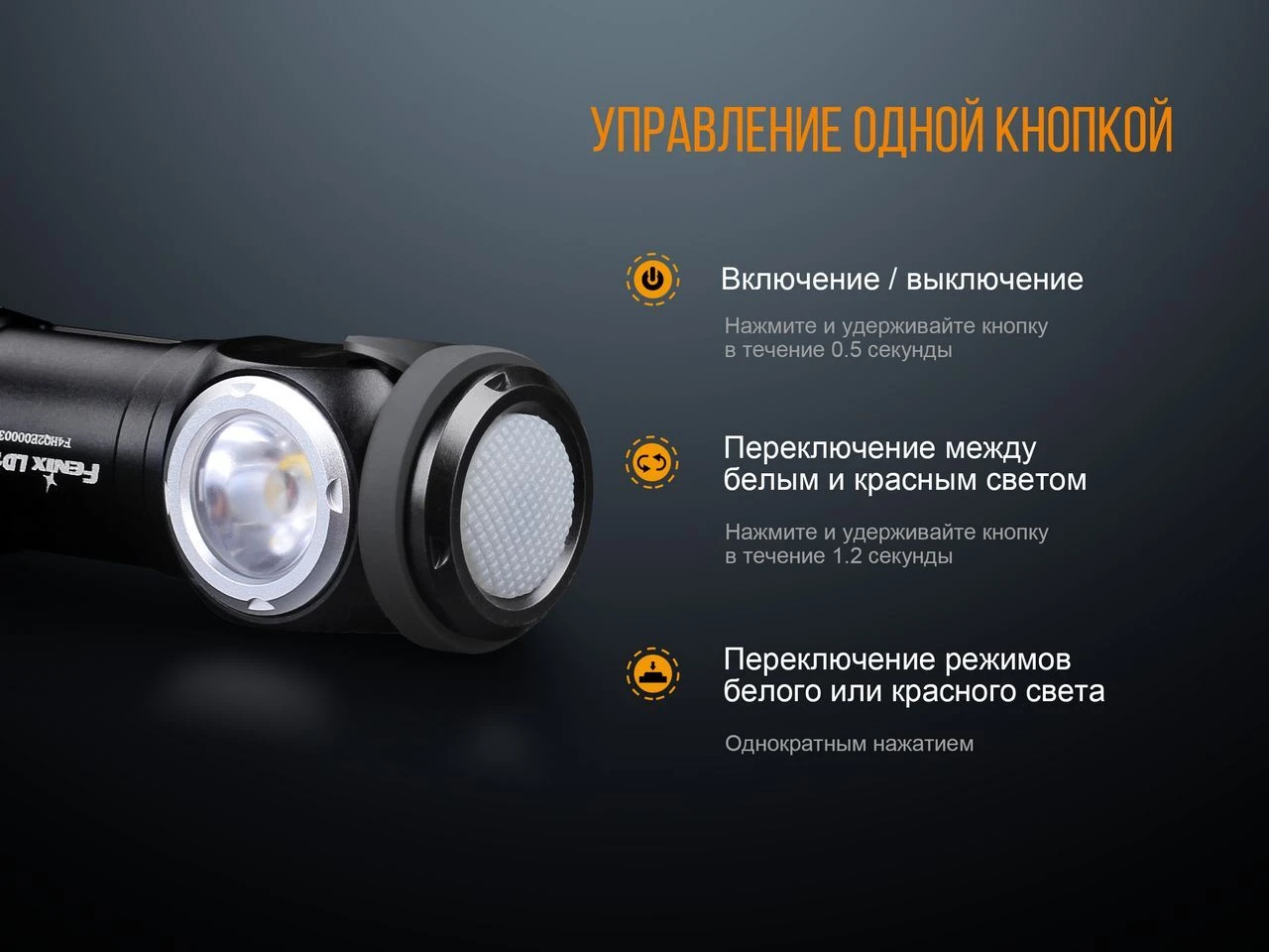 Управлять фонарём Fenix LD15R предельно просто, ведь для этого нужно нажимать лишь одну кнопку. Общее количество режимов работы — 7, из них 4 для основного светодиода и 3 для красного: