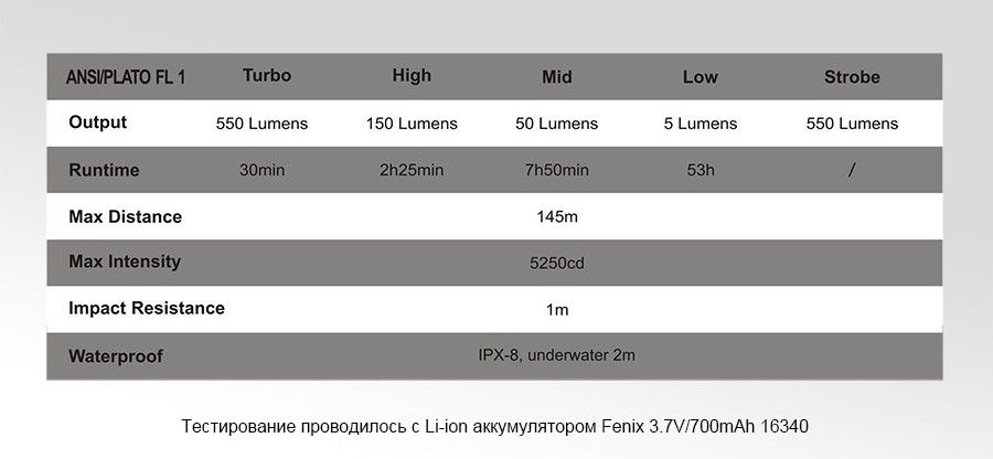 Модель Fenix RC09Ti поддерживает работу в пяти режимах, из которых один является сигнальным. Владельцу этого фонаря доступна яркость 5, 50, 150, 550 люмен и интенсивно мигающий стробоскоп с яркостью 550 люмен. Расстояние, на которое может проникать луч фонаря, достигает 145 метров. Рефлектор в этой модели неглубокий, поэтому луч света достаточно широкий и хорошо освещает периферийное пространство.