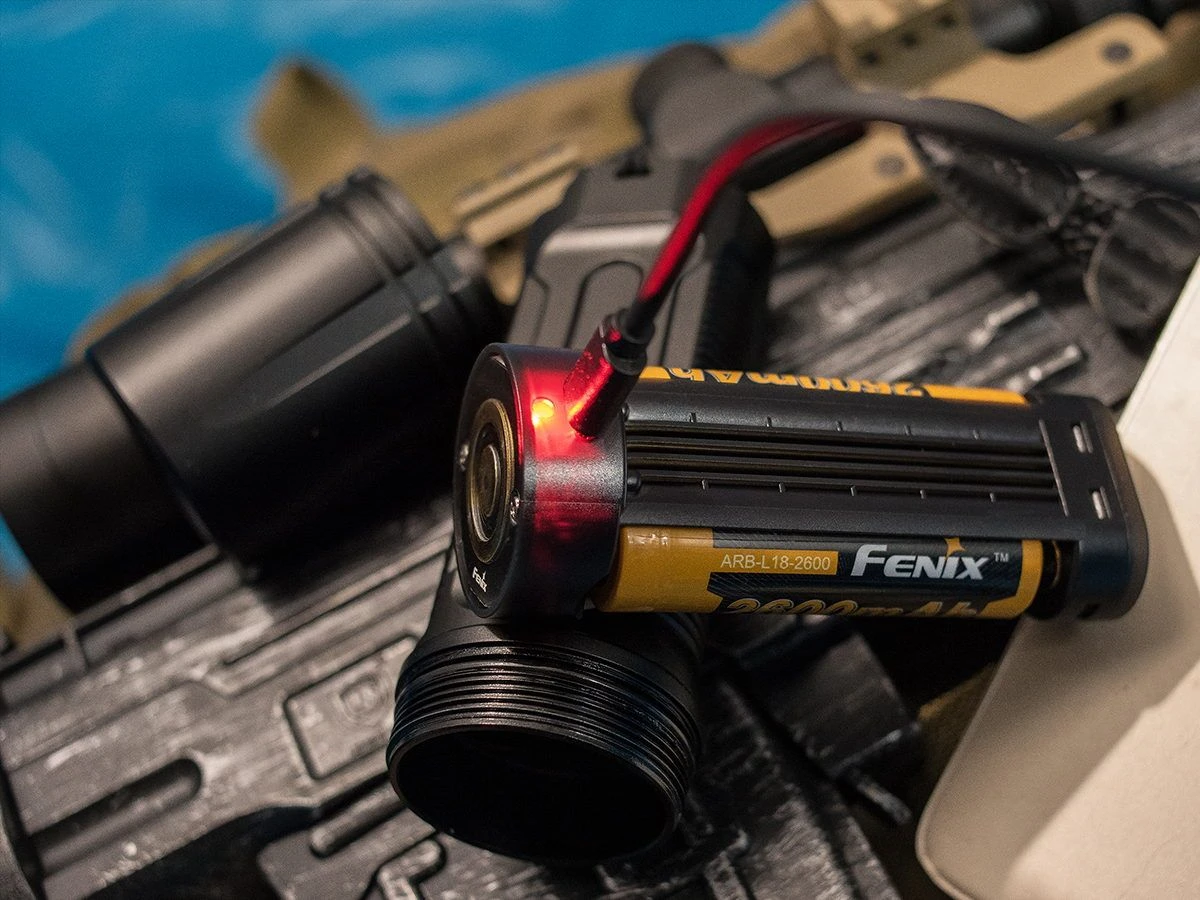К слову, в модели Fenix TK35 (2018) применяется специальная съемная «кассета» куда устанавливаются элементы питания. Она имеет micro-USB порт, через который можно заряжать установленные аккумуляторы. Возле порта micro-USB присутствует один светодиод с помощью которого отображается прогресс зарядки (горит красный — идёт зарядка, горит зеленый — зарядка завершена).