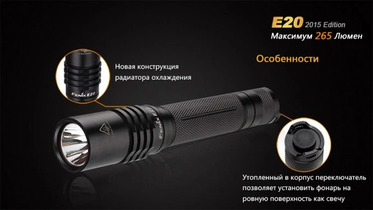 Внешне Fenix Е20 (2015) тоже отличается от предыдущей модели. Корпус стал короче на 6 мм, на 0,5 мм уже в диаметре головы и на 5 мм — в диаметре остальной части. Кроме того, фонарь потерял в весе 4 г. С деталей головной части авторы фонаря убрали ромбовидную накатку, оставив ее только в области батарейного отсека, где она служит для устранения скольжения фонаря в ладони. Зато на голове Е20 появились охлаждающие ребра, которые помогают избавиться от лишнего тепла во время работы светодиода.