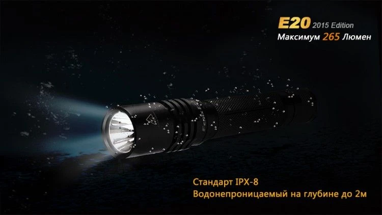 Корпус Fenix Е20 (2015) выполнен из покрытого анодированием алюминия. Он защищает фонарь не только от ударов и прочих механических повреждений, но и от воды, поскольку водонепроницаемость оболочки соответствует наиболее строгому стандарту IPX-8.