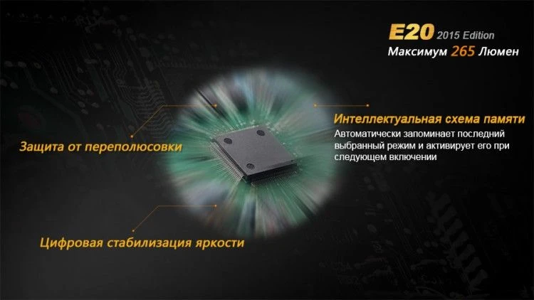 И еще немного подробностей о фонаре Fenix Е20 (2015) для тех, кто не знаком с предыдущей версией. Фонарь управляется одной лишь кнопкой в торце корпуса. Все режимы в нем переключаются последовательно. Причем последний активный перед выключением, фонарь «запомнит», чтобы активировать его сразу после следующего включения. Также в данной модели используются механизмы защиты от переполюсовки при установке аккумуляторов и стабилизации яркости освещения.