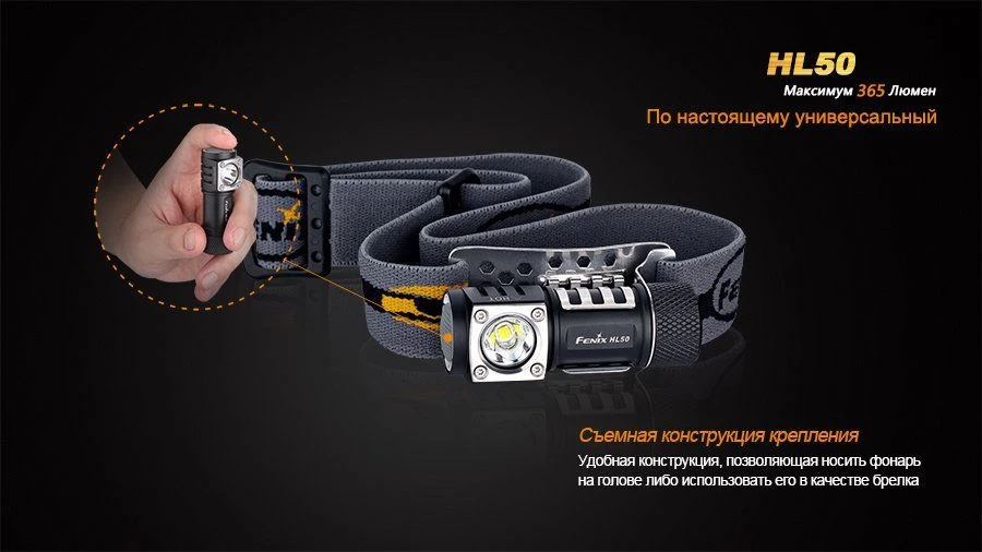 К данной группе относятся легкие и практичные налобные фонари. Особенно большим спросом они пользуются среди туристов, рыбаков, спортсменов. Несомненное преимущество такой конструкции в том, что фонарь оставляет свободными обе руки. Одна из новых моделей этой категории — фонарь Fenix HL50 Cree XM-L2 (Т6). Его можно использовать как в комплекте с ремешками на голову, так и отдельно — в качестве компактного фонарика-брелка. При своих небольших размерах, HL50 работает в 4 режимах с максимальной яркостью до 365 люмен.