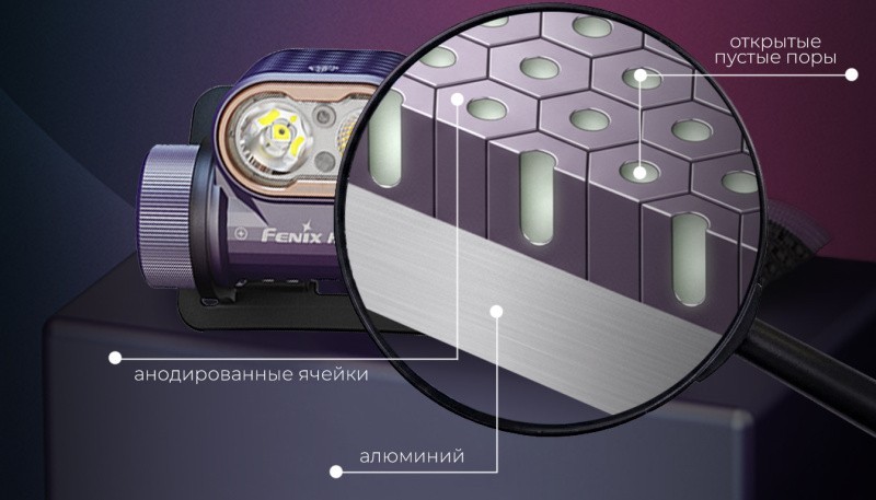 Сразу после анодирования слой остается пористым, его поверхность покрыта микроскопическими “пещерами”. В такие микропоры вводят электролитический краситель – за счет чего фонари Fenix получают свой фирменный графитово-черный оттенок.