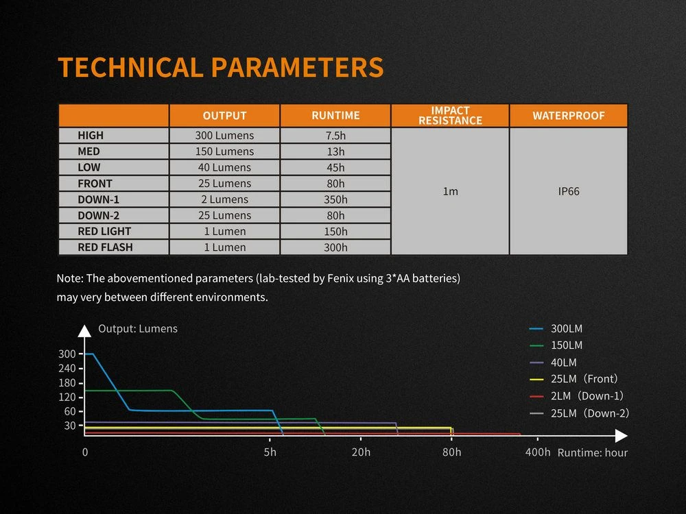Выбор параметров освещения у Fenix СL23 наиболее широк среди всех моделей кемпинговых фонарей этого производителя. И дело даже не в том, что фонарь дает как белый, так и красный свет, а в том, что направление освещения пользователь может выбрать в зависимости от поставленной цели. Так, этот фонарь может светить сразу во все стороны, как это и принято у кемпинговых моделей, а может давать направленный поток света в сторону или же вниз. Для всех доступных режимов работы производители указали яркость и время работы с полным комплектом качественных аккумуляторов: