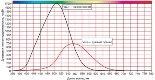 В зависимости от освещения, меняется восприимчивость глаз и к длине волны цвета. Адаптировавшееся к темноте, зрение лучше воспринимает волны длиной около 511 нм, а вот спектр выше 620 нм начинает восприниматься плохо.
