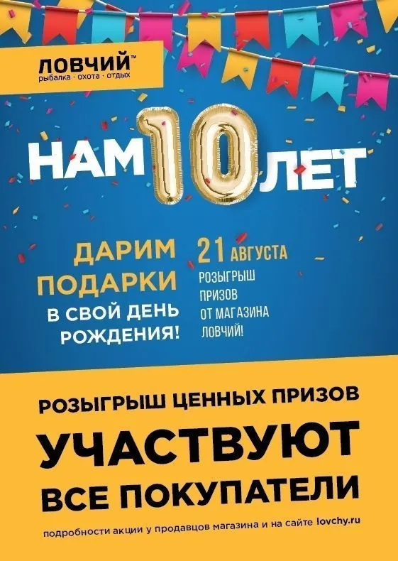 Магазин товаров для охоты и рыбалки «Ловчий» провел розыгрыш в честь своего 10-летнего юбилея. Согласно условиям акции, на ценные призы могли рассчитывать все покупатели розничного и интернет-магазина «Ловчий», приобретя товары на сумму свыше 200 рублей. В розничном магазине клиентам выдавался Кассовый чек с номером Купона участника. В интернет-магазине участникам акции выдавалась Реализация товаров, номером для розыгрыша являлся номер документа Реализации. Акция проходила в период с 01 по 21 августа 2019 года. Розыгрыш подарков состоялся 21 августа 2019 года в 12-30 в магазине «Ловчий».