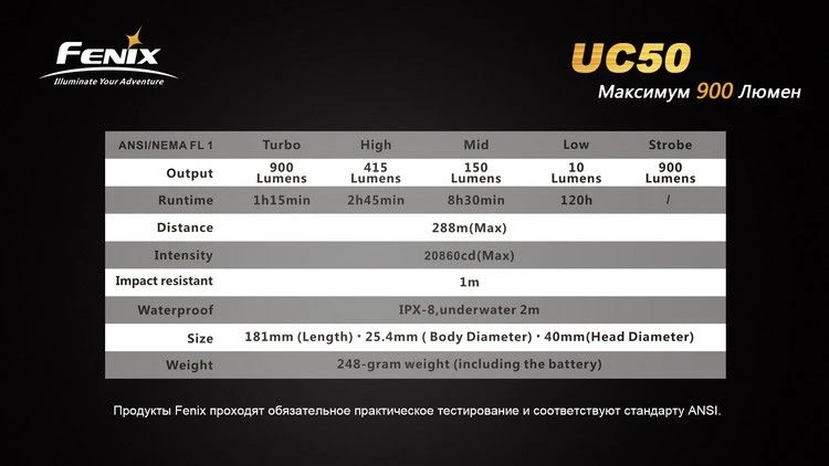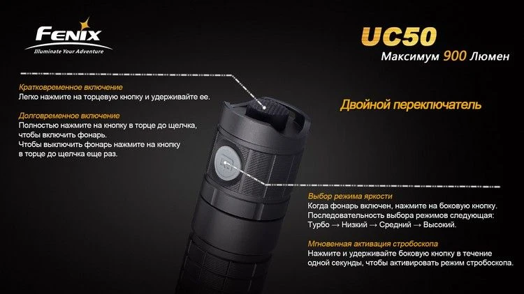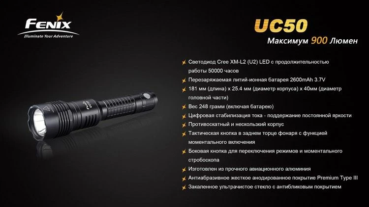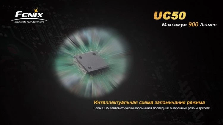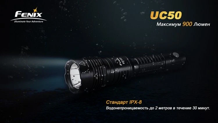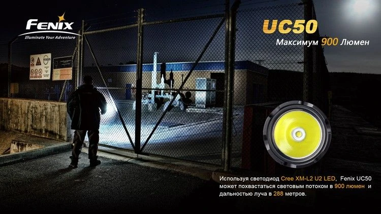 Недавно компания Fenix пополнила модельный ряд серии аккумуляторных фонарей мощным, эргономичным, безопасным и надежным UC50, оснащенным современным высокопродуктивным светодиодом CreeXM-L2(U2). Фонарь предлагает 900люмен яркости в максимальном режиме, 288м дальнобойности и 120часовбеспрерывного освещения в экономном режиме, что способно удовлетворить самые разнообразные потребности в обеспечении отличной видимости в темное время суток или в неосвещённых помещениях.