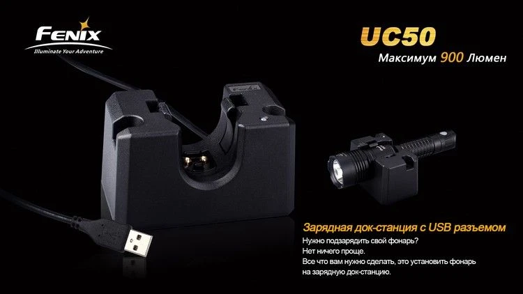 Данная модель, безусловно, станет замечательным помощником для охотника, туриста, спелеолога, рыбака или велосипедиста благодаря своему компактному дизайну, высокой производительности, большому запасу рабочего времени и реальной автономности. FenixUC50, как и все UC фонари, поставляется в комплекте с док-станцией с USB-разъемом, что позволяет прибору быть независимым от сменных элементов питания и избавляет покупателя от приобретения сопутствующих товаров, таких как: батарейки, аккумуляторы и зарядное устройства к ним.