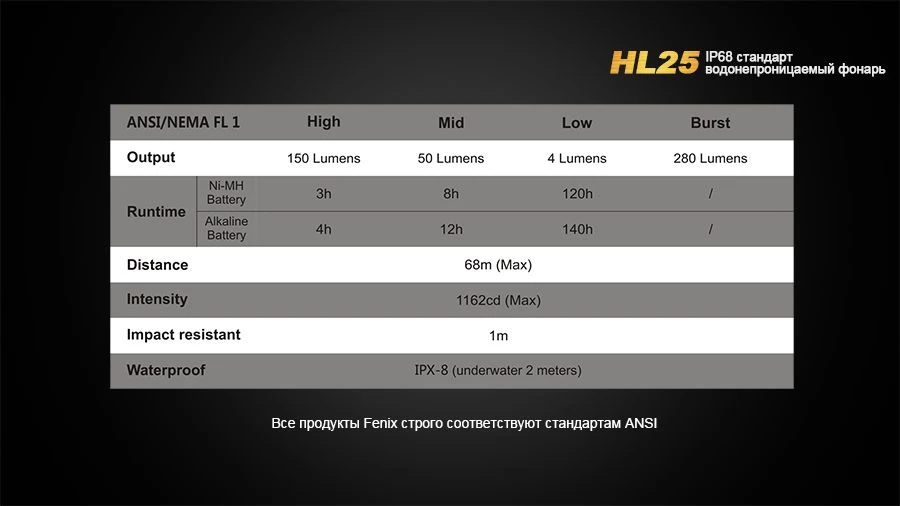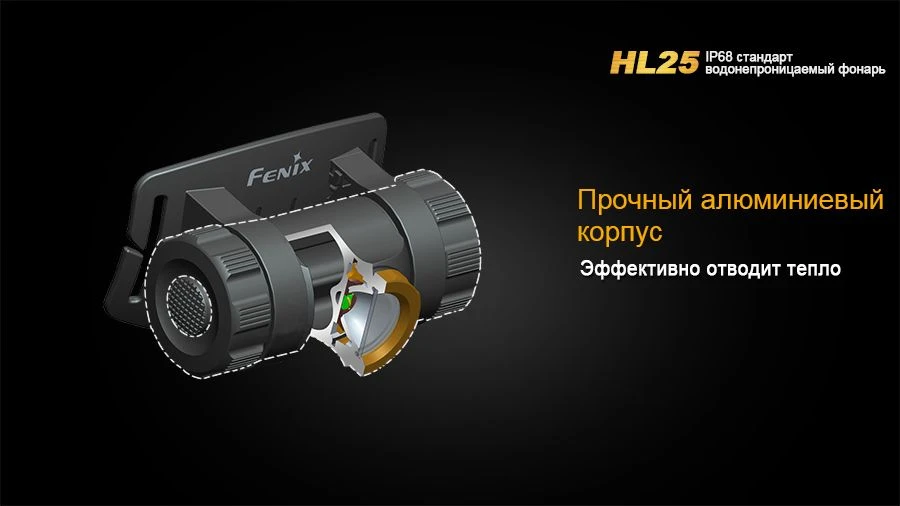 Внешняя оболочка Fenix HL25 изготовлена из алюминиевого сплава, который широко используется в авиации. Это чрезвычайно прочный материал с анодированным покрытием класса Premium Type III, которое защищает от коррозии и воздействия различных абразивов. Класс защиты корпуса — IP68. Это значит, что фонарь можно включать под дождем и даже погружать под воду на глубину до 2 метров. А также он не боится воздействия песка, пыли и прочих мелких частиц, которые ни при каких условиях не попадут внутрь корпуса, а также защитит устройство при падении с высоты до 1,5 метров. Крепления к ремешкам на голову сделаны из прочного пластика и также являются надежными и долговечными.