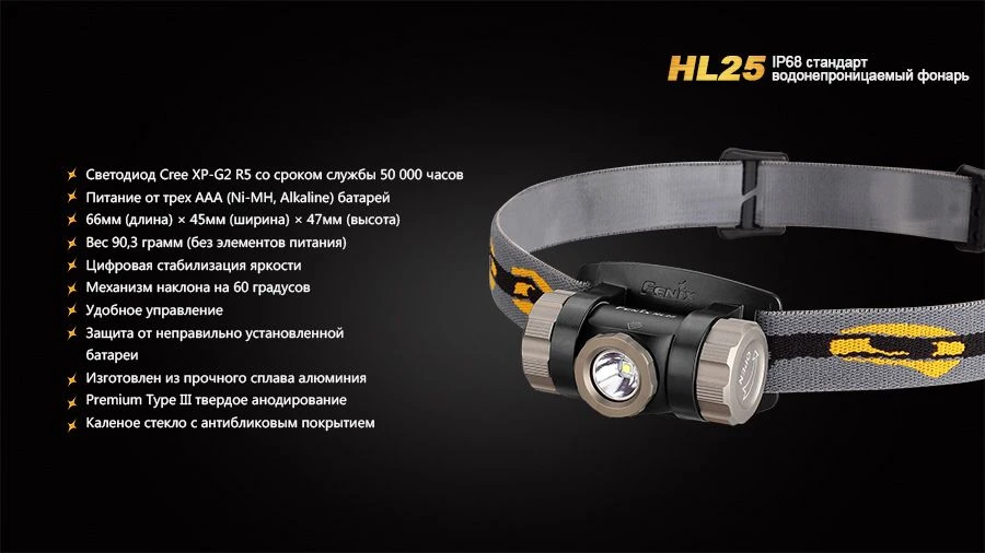Модель Fenix HL25 можно использовать и как налобный фонарь, для чего в комплект входит специальный эластичный ремешок на голову, и как ручное осветительное устройство. Чтобы было проще настроить направление светового потока, корпус фонаря поворачивается в пределах 60°.