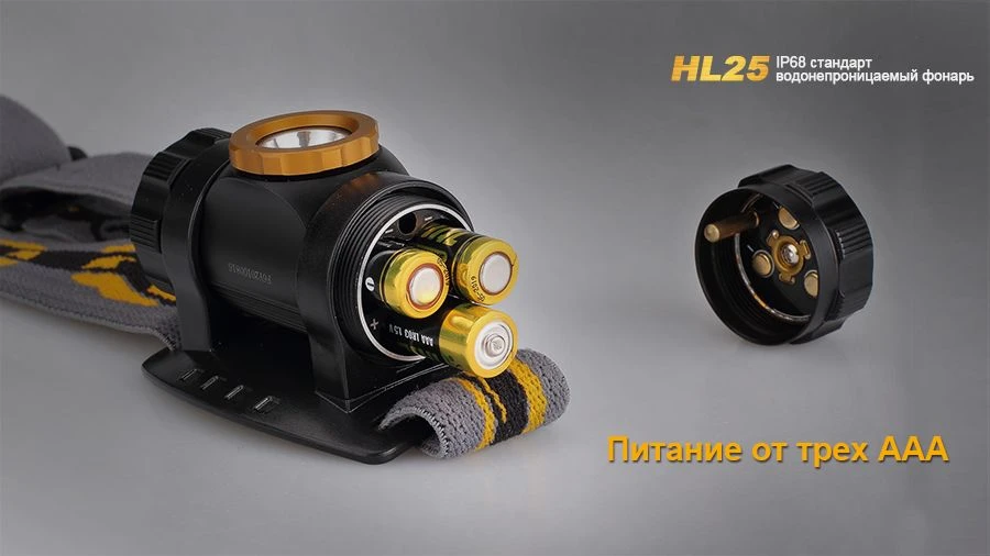 В качестве элементов питания Fenix HL25 потребуются 3 микропальчиковых батареи (формат ААА). Использовать можно Ni-MH аккумуляторы — в этом случае устройство может проработать до 120 часов в экономном режиме; или же Alkaline батареи, которые могут питать фонарь до 140 часов. Размещаются элементы питания внутри корпуса фонаря, поэтому их вес тоже приходится на голову.