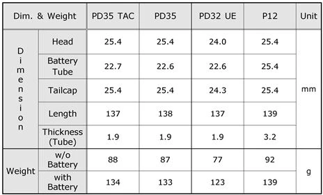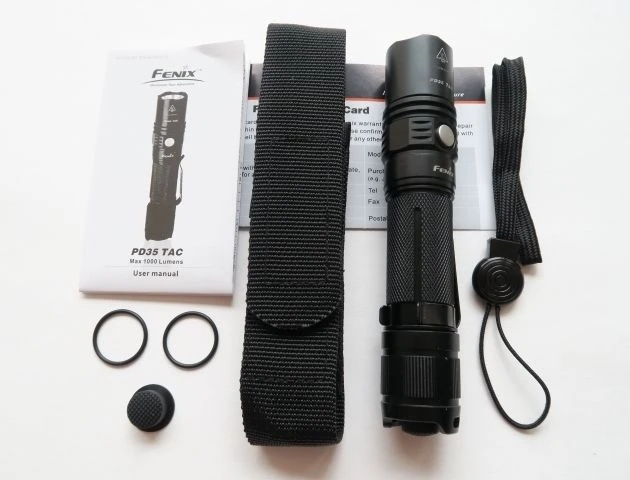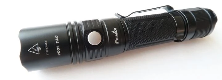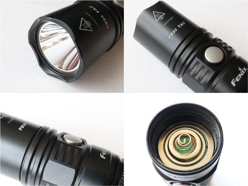 PD35 ТАС немного короче, чем PD35. Голова PD35 TAC короче, чем у других фонарей, но отсек для аккумуляторов немного длиннее. Это дает дополнительное пространство, чтобы установить чуть больший по размеру аккумулятор формата18650 с защитой. PD35 TAC управляется при помощи двух переключателей. Но форма и материал боковой кнопки были полностью изменены. Теперь фонарь имеет круглую кнопку из нержавеющей стали в головной части.