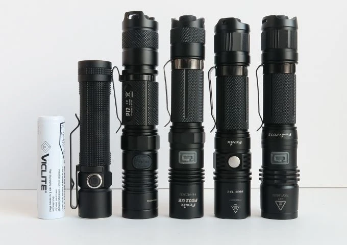 На этой фотографии слева направо: аккумулятор VicLite 18650 (2600mAh) с защитой, Olight S20 (XM-L2), Nitecore P12 (XM-L2 T6), Fenix PD32 UE (XM-L T6 СЗ), Fenix PD35 TAC (XP-L V5), Fenix PD35 (XM-L2 U2).