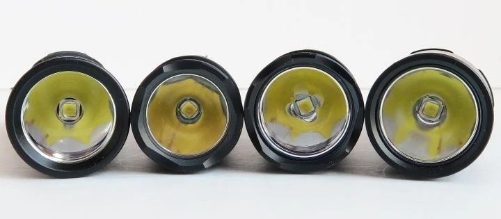 Слева направо: Nitecore P12 (XM-L2 T6), Fenix PD32 UE (XM-L T6 СЗ), Fenix PD35 TAC (XP-L V5), Fenix PD35 (XM-L2 U2). Диаметр головы фонарей такой же, как в PD35.