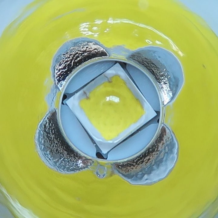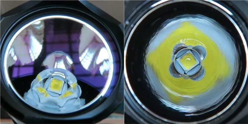 Передняя линза фонаря имеет антибликовое покрытие и на ней отражается фиолетовый оттенок. Поверхность алюминиевого рефлектора гладкая. В результате визуального осмотра, никаких изъянов на отражателе обнаружено не было. Центровка светодиода в рефлекторе в случае с моим фонарем не идеальна, но на качестве луча это не отражается.