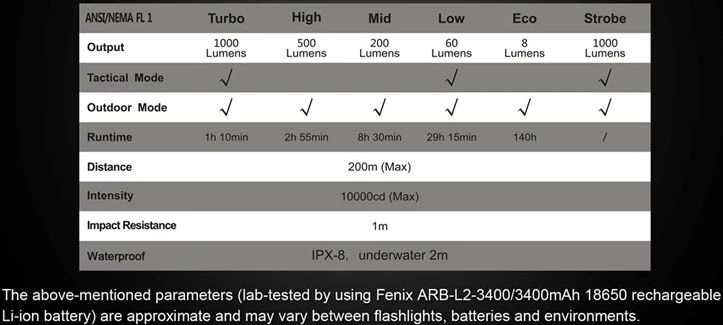 Последовательность смены рабочих режимов такая: Eco -> Low -> Mid. -> High -> Turbo. Эти режимы повторяются циклически. Фонарь располагает функцией интеллектуального запоминания и оставляет в памяти информацию о том, какой из режимов пользователь выбрал в прошлый раз. Последний выбранный перед выключением режим яркости включится первым во время следующего сеанса работы с фонарем даже в том случае, если вы замените элемент питания.