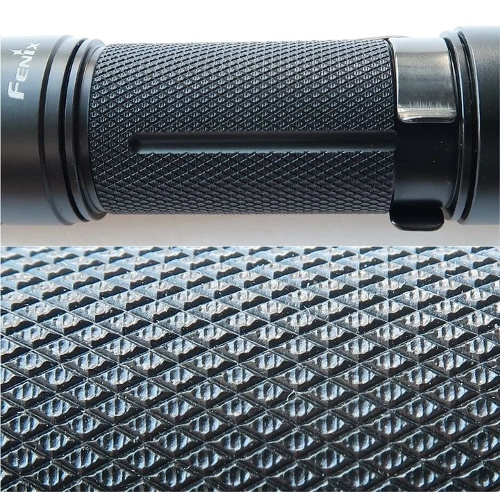 Как и на предыдущей модели, анодированное покрытие у Fenix PD35 TAC матовое черное и ровное на всем корпусе без каких-либо царапин и изъянов. Надписи на корпусе фонаря четкие и ясные. На самом деле, они не настолько яркие и белые, как у некоторых других фонарей Fenix, но это даже хорошо, потому что они не так сильно оттягивают на себя внимание. Металлическая клипса, с помощью которой фонарь фиксируется в кармане, плотно держится на корпусе. Она выглядит очень крепко и солидно. Корпус фонаря имеет некоторые углубления и неровности в дизайне корпуса, которые способствуют тому, чтобы он не выскальзывал из рук. Но в этом отношении клипса тоже достаточно эффективна.