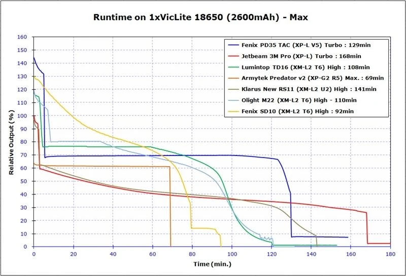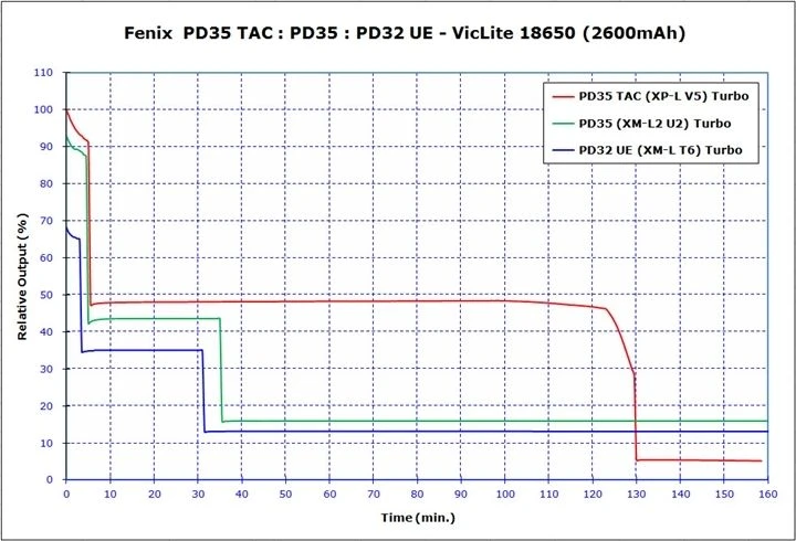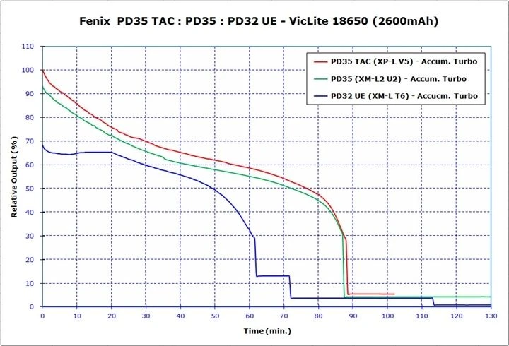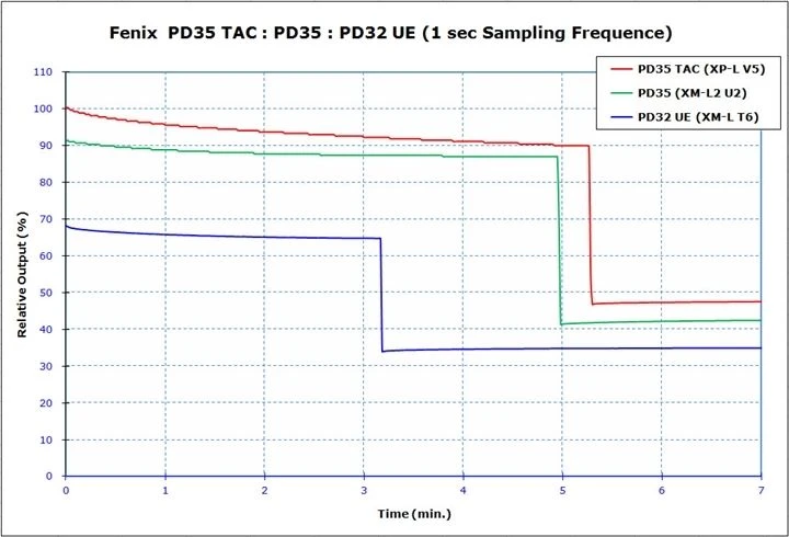 Три фонаря этой серии дают аналогичные показатели понижения яркости света в разных режимах. Но PD35 TAC дольше держит яркость и не переключается в режим High. Это показывает его превосходную эффективность и отрегулированность.