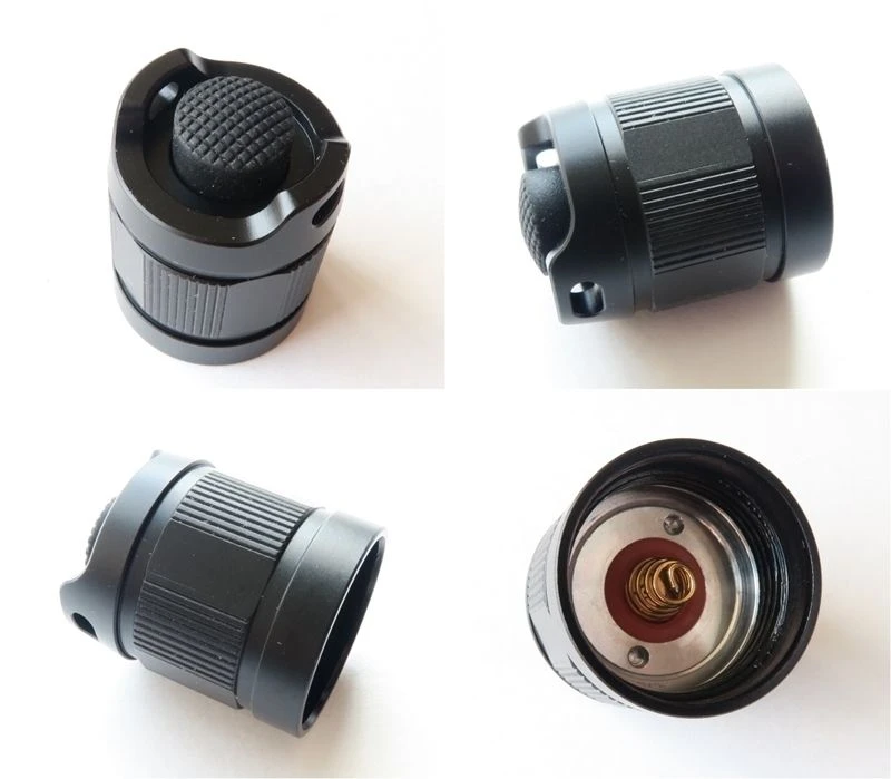 Хвостовая часть фонаря Fenix PD35 TAC физически не отличима от аналогичной детали PD35. В фонаре используется кнопка прямого хода, которая делает возможным быстрый доступ к освещению. Резиновая накладка на кнопку выступает за пределы корпуса, поэтому фонарь не удастся установить в положение свечи. Переключатель срабатывает со средней жесткостью хода. Нажимать на эту кнопку удобно любым пальцем: большим или указательным. Кроме того, в хвостовой детали есть два небольших отверстия для прикрепления ремешка.