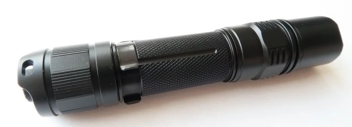 Дизайн аккумуляторного отсека сдержанный. Эта деталь вмещает один литий-ионный аккумулятор 18650 или же две литиевые батарейки CR123A. Размер трубки позволяет установить и немного более широкие и длинные аккумуляторы 18650 со встроенной защитой. На поверхность корпуса нанесена умеренно-агрессивная накатка. Но в сочетании с другими элементами: ребрами охлаждения, декагональной частью головы фонаря, клипсой и другими деталями, эта накатка способствует хорошему сцеплению поверхности корпуса и кожей ладони пользователя фонаря.
