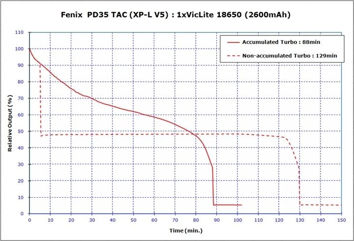 Это суммарный график работы фонаря в режиме High. Если фонарь понизит яркость автоматически, его график работы будет похож на этот. Это касается компактных фонарей с полной регулировкой температуры во время работы. Они могут снизить яркость под действием контроллера температуры. Короче говоря, учитывая высокий уровень теплоотдачи небольших фонарей в режимах высокой яркости, встроенный механизм понижения яркости им необходим. Это даст большую эффективность при длительной работе. Так, PD35 TAC показал себя действительно эффективным.