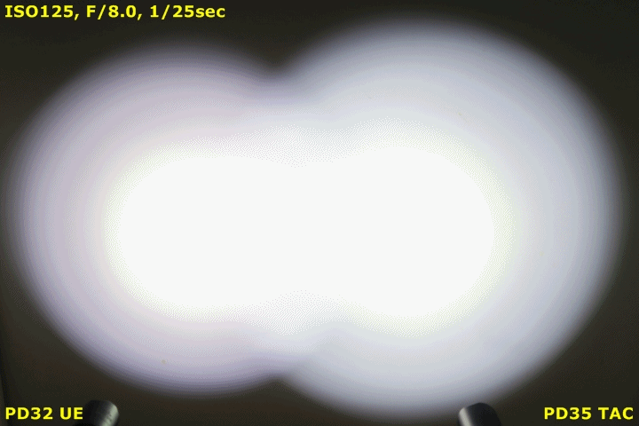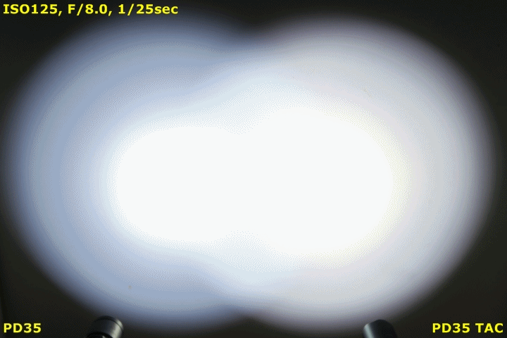Форма луча ровная, с широкой боковой засветкой. PD35 TAC имеет хорошую производительность для фонаря своего класса, учитывая размеры его головы и отражателя.