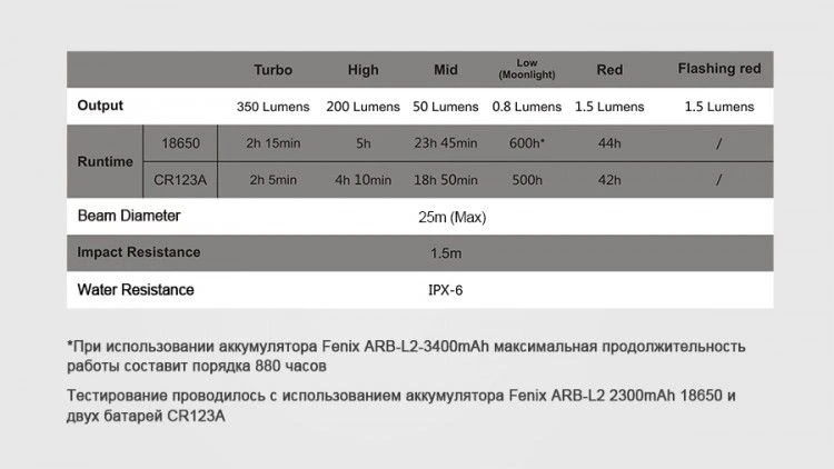 Ну а теперь самое время поговорить о Fenix CL25 подробно. Вот какую информацию мы можем узнать по упаковке: фонарь работает на двух типах элементов питания. Влагозащищенность корпуса IPX-6 говорит о том, что ему не страшны атмосферные осадки. Кроме того, Fenix CL25 не боится мороза, а заряжать его можно при помощи кабеля micro-USB.