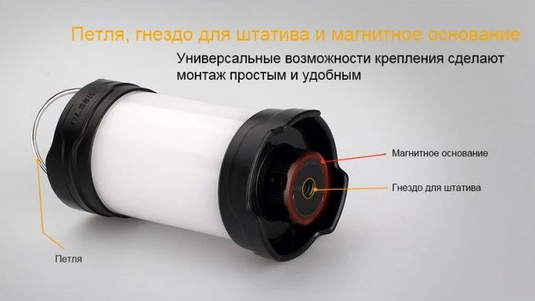 Еще немного о дополнительных фишках кемпингового фонаря. Его задняя крышка отлично магнитится к любым железным поверхностям. Помимо того, на ней есть резьба в четверть дюйма, которая совместима с любыми штативами, селфи-палками. В палатке же фонарь можно подвесить за кольцо на верхней крышке корпуса.