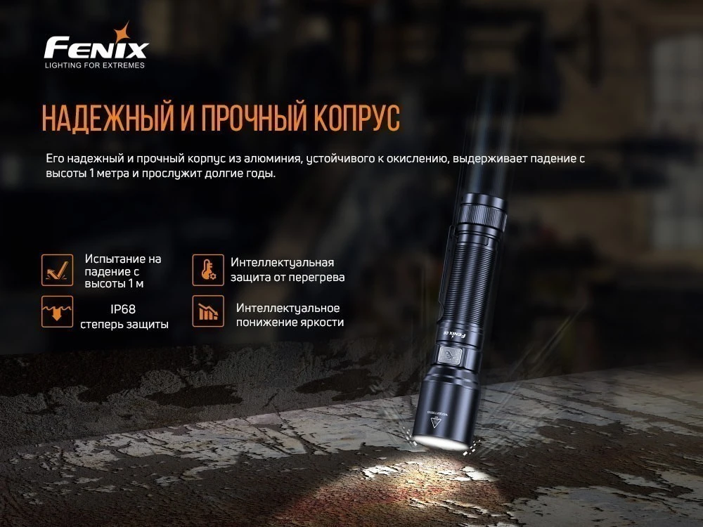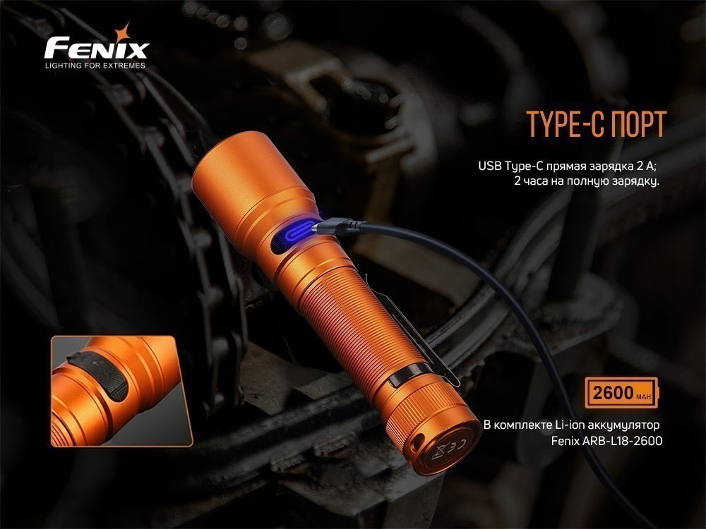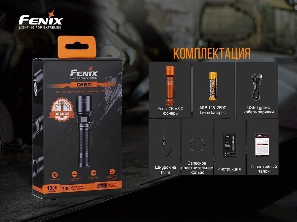 Комплектация: фонарь модели Fenix C6V3.0, ARB-L18-2600 Li-ion аккумулятор, USB Type-C кабель зарядки, ремешок на руку, уплотнительное кольцо, инструкция к применению, карточка гарантии.