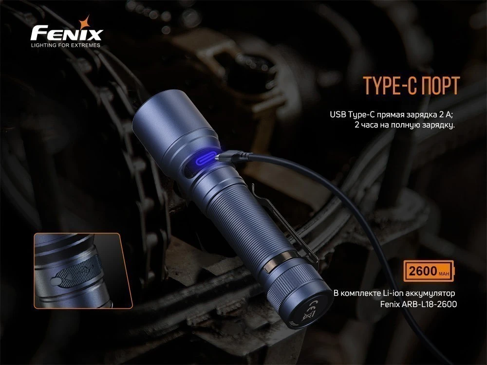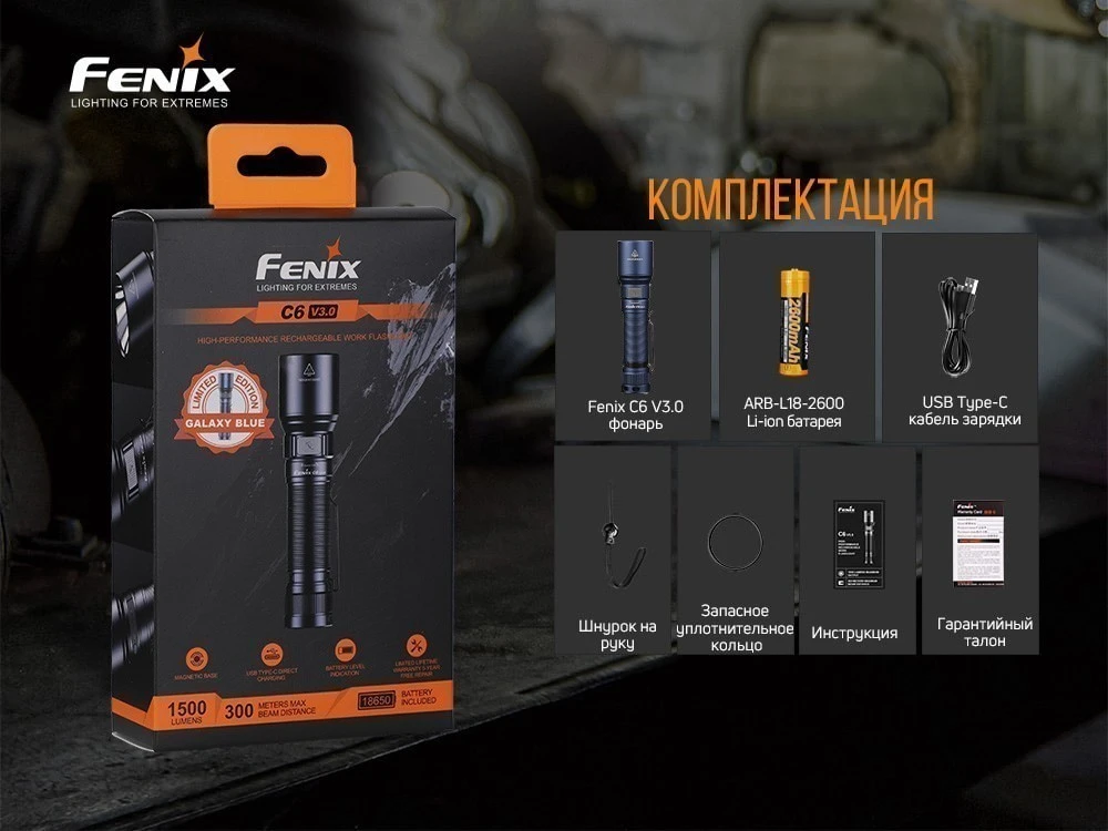 Комплектация: фонарь модели Fenix C6V3.0, ARB-L18-2600 Li-ion аккумулятор, USB Type-C кабель зарядки, ремешок на руку, уплотнительное кольцо, инструкция к применению, карточка гарантии.