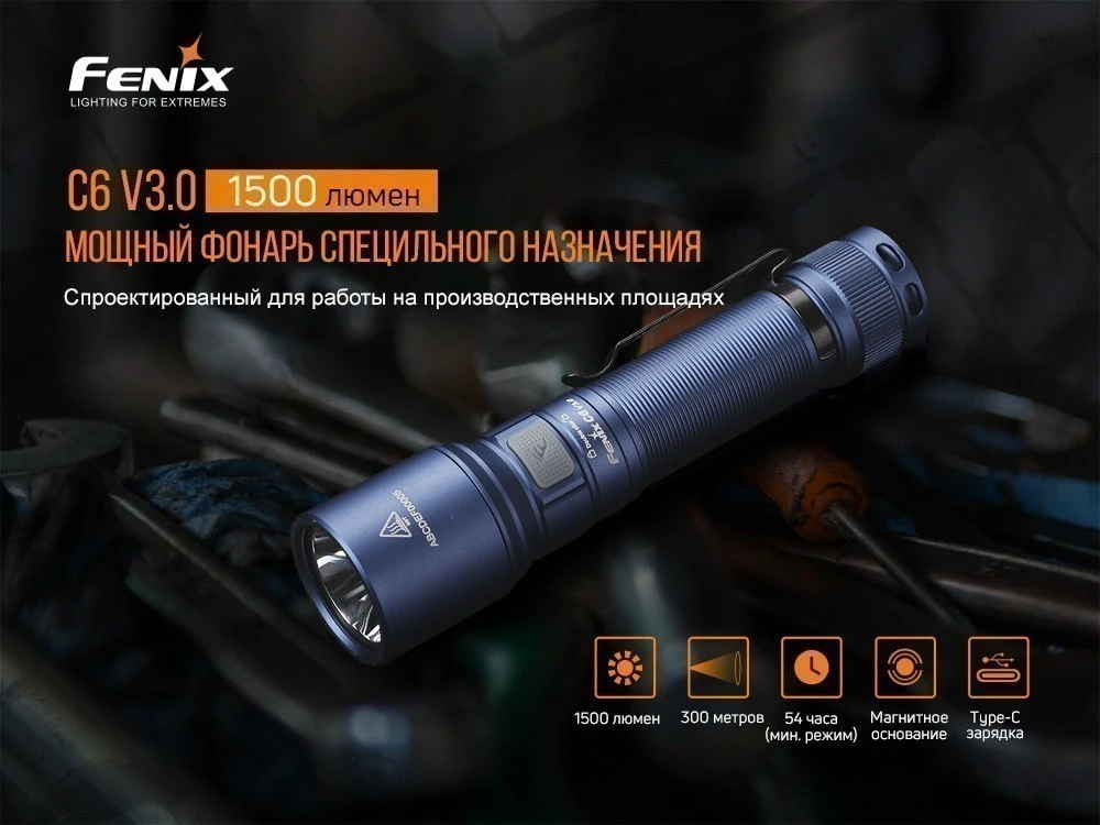 Фонарь модели Fenix C6V3.0 — это небольшой ручной прибор, даёт максимальный световой поток до 1500 люменов. При этом наибольшая дистанция освещения достигает 300 метров. Функционирует на светодиоде Luminus SST40, срок службы которого составляет 50 тысяч часов. Питается фонарь за счёт литий-ионного аккумулятора 18650 ёмкостью 2600 мА*ч. Заряжается посредством USB Type-C, зарядный ток – 2 ампера. Для того, чтобы полностью зарядить модель, вам понадобится два часа времени.