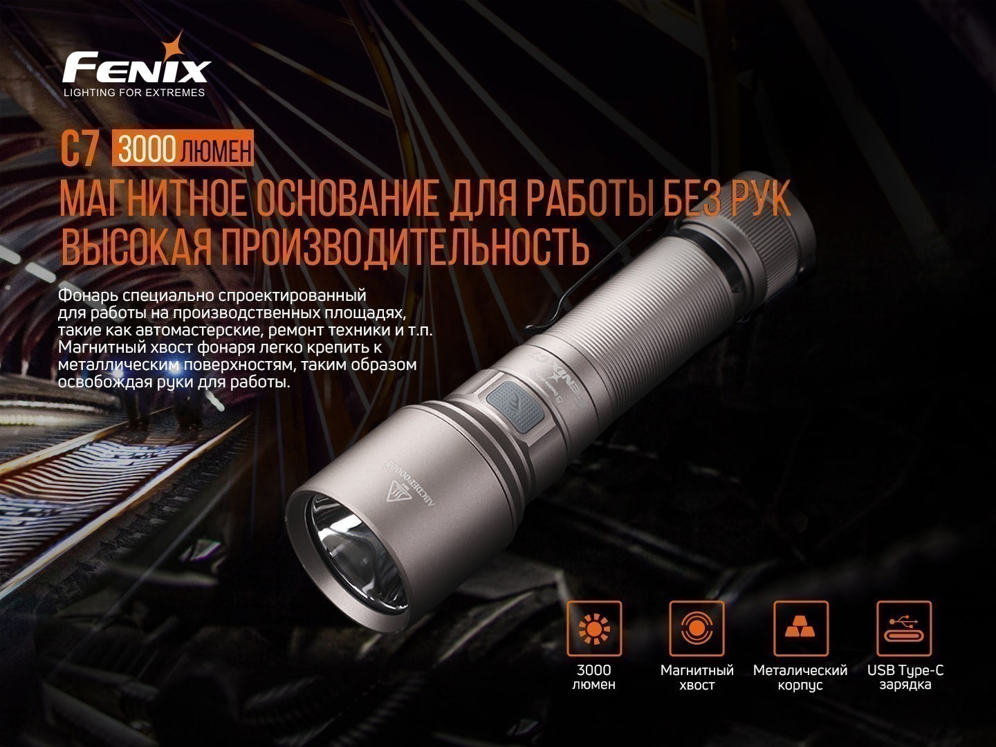 Фонарь Fenix C7 – высокопроизводительная ручная модель для промышленного обслуживания и применения. Зарядка осуществляется при помощи USB Type-C с включённой литий-ионной батареей ёмкостью 5000 мАч. Способен давать наибольшую яркость освещения в 3000 люменов в турбо-режиме при дистанции луча до 470 метров.