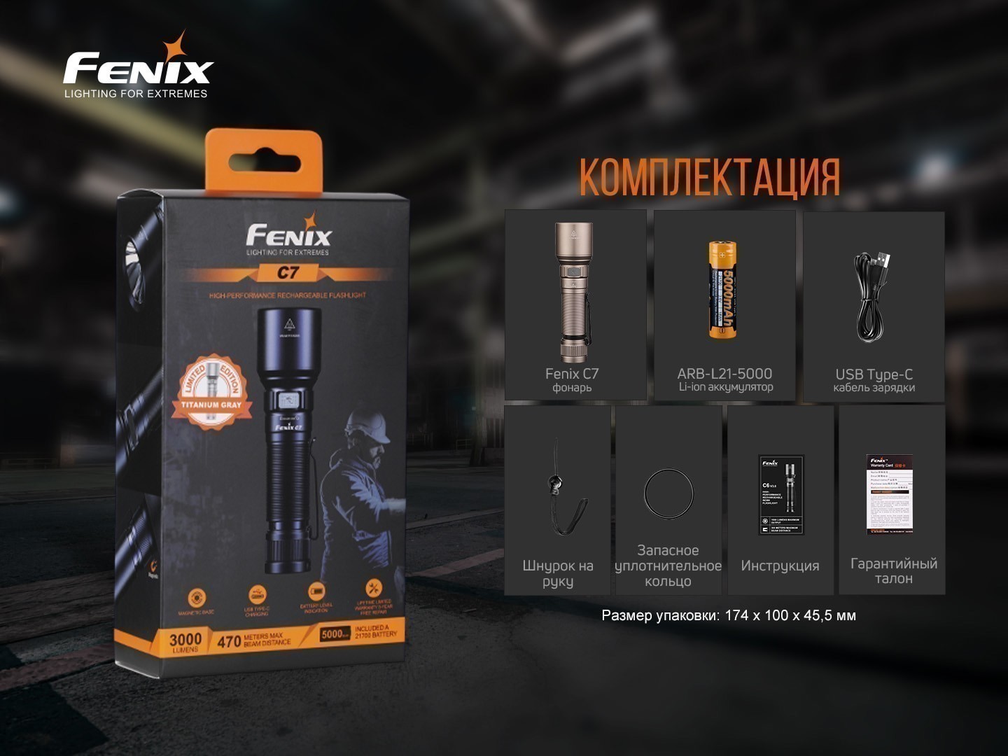 Модель фонаря Fenix C7, батарея литий-ионная Fenix ARB-L21-5000, кабель для зарядки USB Type-C, темляк, запасное уплотнительное кольцо, руководство пользователя, талон гарантии.