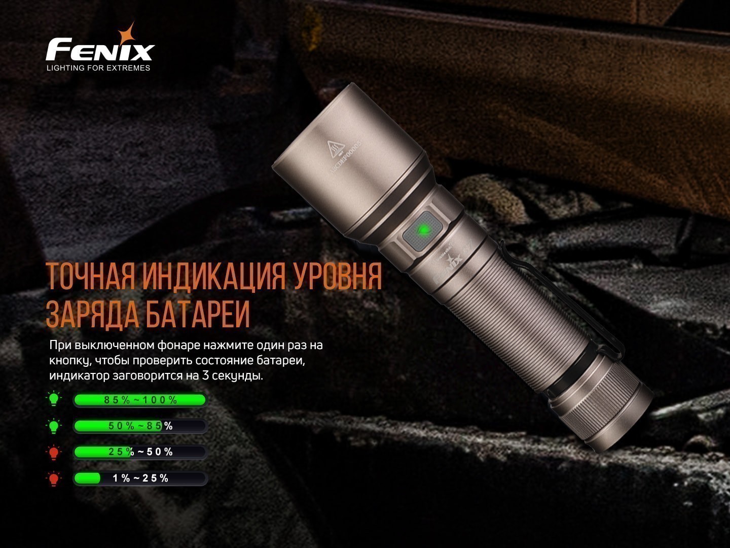 Приведённые показатели работы фонаря были получены в ходе лабораторных испытаний при использовании одного литий-ионного аккумулятора Fenix ARB-L21-5000. Температура воздуха составляла около 21±3°C, влажность — 50%-80%. Параметры работы могут незначительно отличаться в зависимости от условий эксплуатации.
