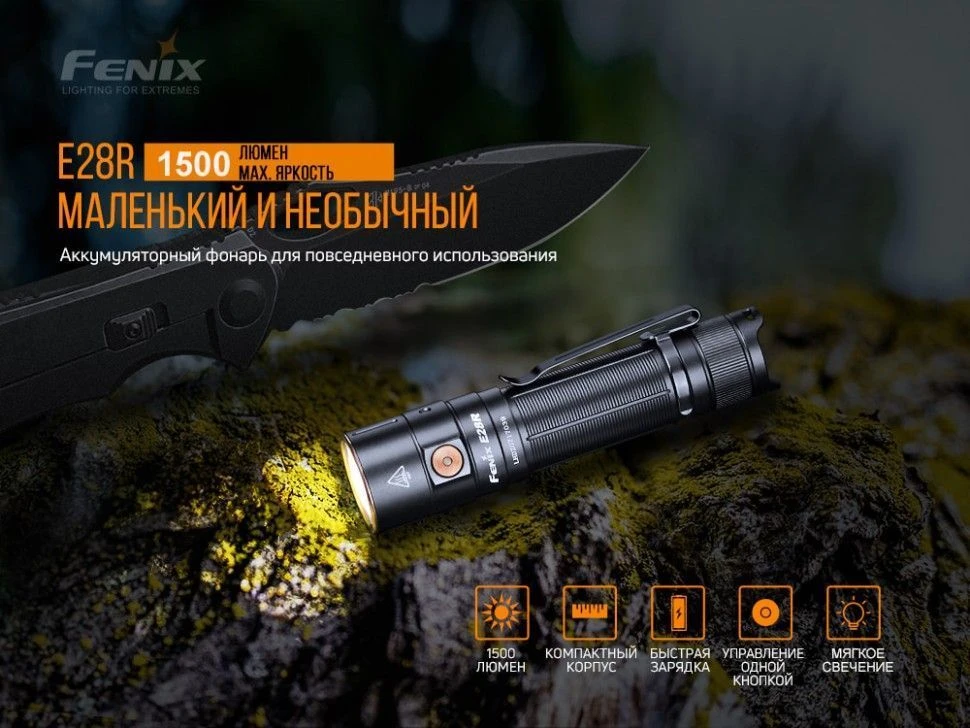 Fenix E28R можно задействовать каждый день, другими словами, он входит в категорию EDC-моделей. Этот фонарь уже давно ждали и хотели приобрести любители компактных устройств. E28R способен заряжаться через кабель USB Type-C, сам же кабель для этой цели вошёл в набор аксессуаров к фонарю. Также модель имеет внутреннюю гидроизоляционную обработку. Функционирует при использовании батареи типоразмера 18650, но здесь также окажут пользу и одноразовые батареи CR123A.