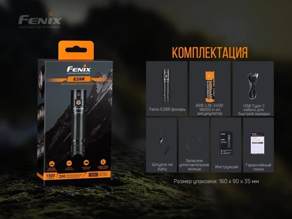 Модель фонаря Fenix E28R, аккумулятор форм-фактора 18650, кабель быстрой зарядки USB Type-C, ремешок, запасное уплотнительное кольцо, инструкция пользователя, талон гарантии.