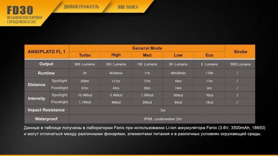 Максимальную яркость дает режим Turbo – это 900 люмен. Дальность света в этом режиме составляет 67-200 метров, в зависимости от фокусировки. При условии использования аккумулятора с емкостью 3500 мАч, заряда хватит на 2 часа работы. С такой же яркостью работает и стробоскоп, но поскольку этот режим не дает постоянный свет, остальные характеристики для него не рассчитывались.